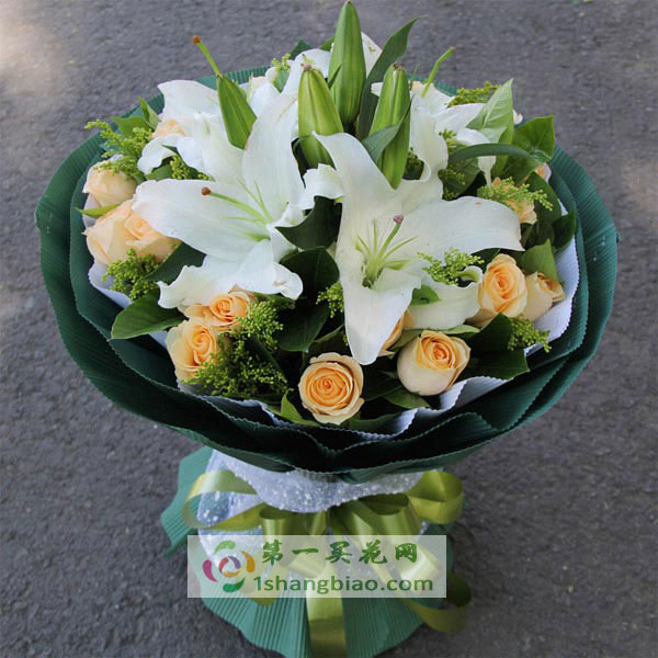 【花材】:11朵香檳玫瑰+3枝香水百合+綠葉、黃英【包裝】:白色、墨綠色 瓦楞紙 如圖圓形包裝
