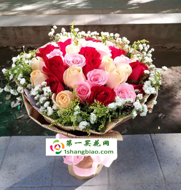 材料:33朵玫瑰(11朵紅+11朵粉+11朵香檳),滿天星 黃英外圍