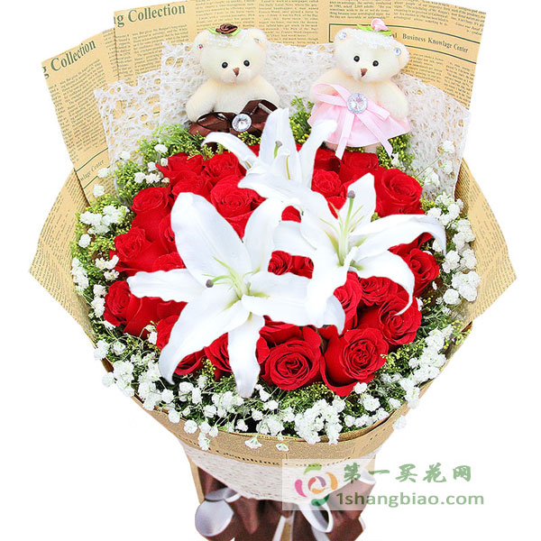 材料:33支紅玫瑰、1支多頭白百合,2只小熊,搭配適量滿天星、黃鶯