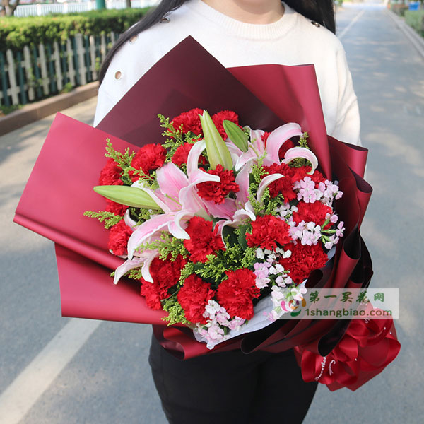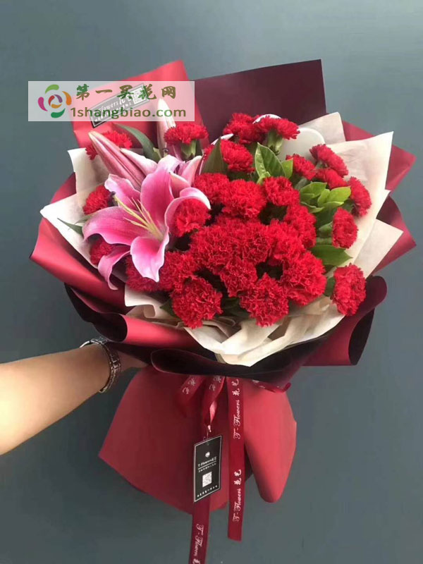 材料:19朵大朵紅色康乃馨,3支粉色百合。相思梅豐滿