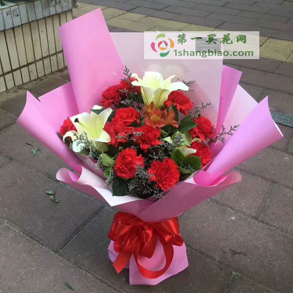 材料:19朵紅色康乃馨,2支百合 配草豐滿