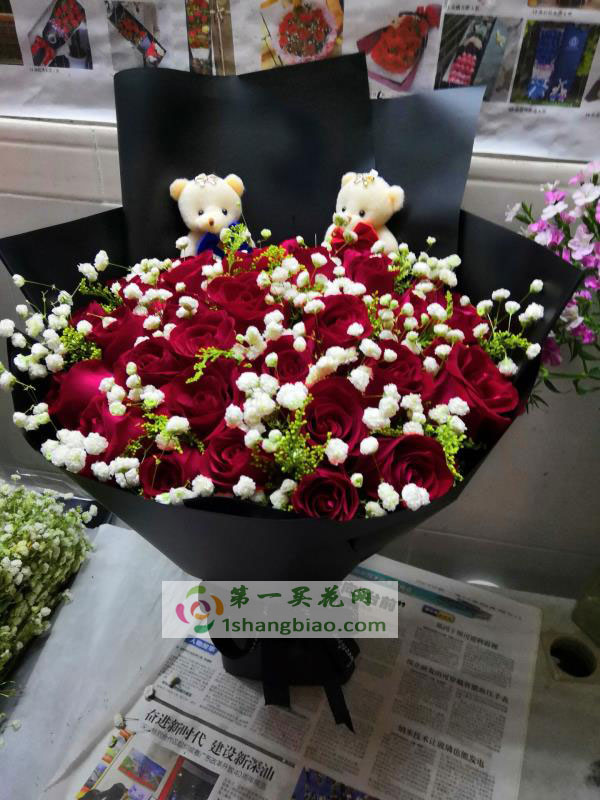 答:北京花店說(shuō)老婆生日老公送33朵紅玫瑰外圍滿天星黃鶯2小熊