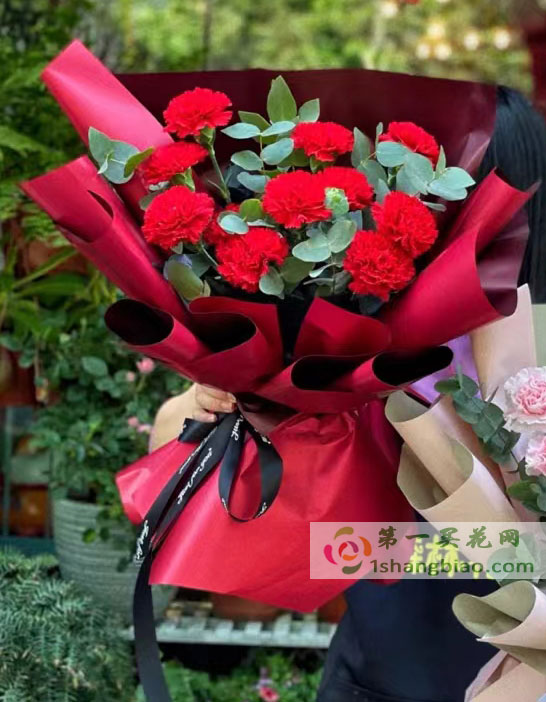 材料:11朵紅色康乃馨,搭配尤加利葉