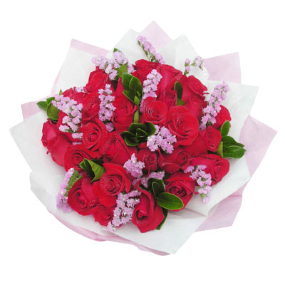 【花材】 33枝紅玫瑰+粉色的勿忘我+綠葉+白粉皺紋紙圓形包裝. 【花語(yǔ)】 對(duì)你的深情永不變,對(duì)你的愛(ài)永不夠,海誓山盟,愿它永遠(yuǎn)留在我們心中