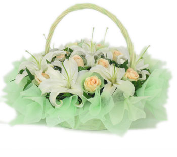 【花材】 手提花籃: 8朵白香水百合+8支粉玫瑰+配花,淡綠棉紙襯托 |