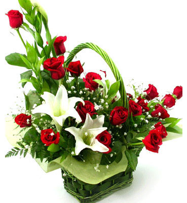【花材】 花籃:19枝紅玫瑰+2朵白百合+配葉 |