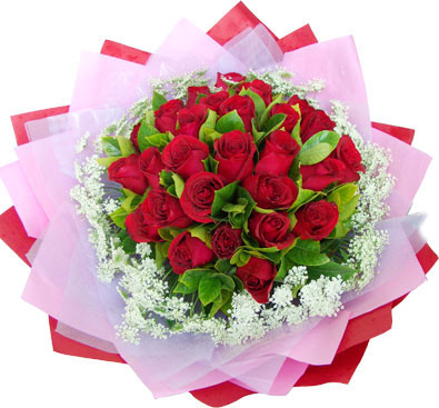 【花材】 花束:29支紅玫瑰+蕾絲+配葉,蕾絲圍繞著紅玫瑰,淡紫色皺紋紙里包裝,紅色皺紋紙外包裝 |