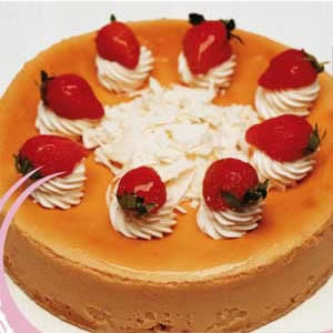 花 材: 酸甜的草莓醬和純正的新西蘭安佳芝士經(jīng)過精心烤制而成,鮮紅欲滴的草莓猶如晶瑩的寶石裝飾在蛋糕表面