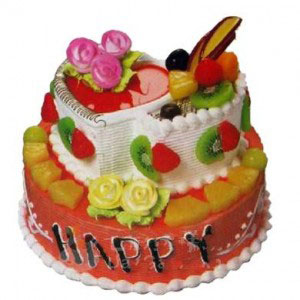 兩層圓形蛋糕上面有心形樣式,由奶油,水果新奶玫瑰等材料裝飾.(6寸+8寸)