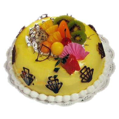 圓形鮮奶水果蛋糕,黃色果漿,水果裝飾。