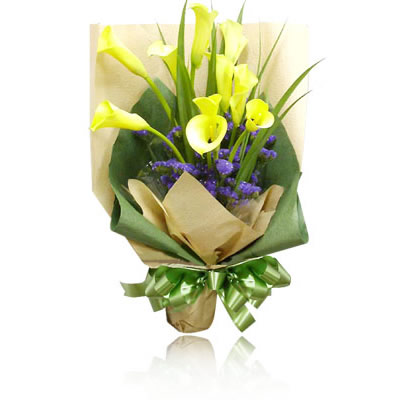 「名 稱」 恰似那低頭的溫柔 「材 料」 11朵馬蹄蓮,勿忘我+黃鶯 「包 裝」 綠色和淡黃色南韓紙圓形束扎 「贈(zèng)送對(duì)象」 戀人, 朋友, 妻子, 丈夫 「鮮花用途」 愛(ài)情 「花 語(yǔ)」
