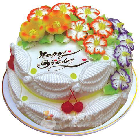 雙層圓形鮮奶蛋糕,各色奶油花裝飾,水果點(diǎn)綴。 (8寸+10寸)