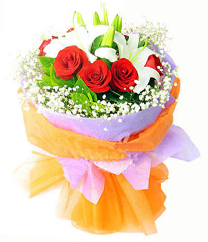 [包裝] 圓形包裝。桔色、紫色綿紙各5張 [花材] 多頭白色香水百合2枝,紅玫瑰9枝,滿天星豐滿。 [花語] 親愛的,擁有你的真心,是我今生最大的幸福.不管世事如何變遷,你永遠(yuǎn)是我心中的唯一和最愛. |