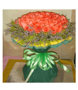 「材 料」 99只粉玫瑰,黃鶯情人草外圍。 「包 裝」 黃色的卷邊紙內(nèi)襯,綠色的卷邊紙外包,綠色的絲帶 「花 語」驚喜生日祝福 真心愛的告白 |