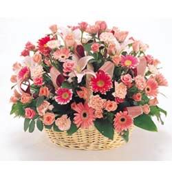 花 材: 6朵粉百合、多色康乃馨33枝,綠葉、太陽花點綴。 包 裝: 藤編有柄花籃圓形插花 花 語: |