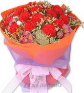 【花材】:紅色康乃馨16支,水晶草、雛菊點(diǎn)綴。 【包裝】:紅色手揉紙圓形包裝,紗網(wǎng)外圍。粉色蝴蝶結(jié)束扎。 【花語】:好希望每天都有溫暖太陽,我心足意滿像現(xiàn)在一樣,是您給我生命,用愛呵護(hù)我成長(zhǎng),我愿用我的一世來回報(bào)您,孝順您到老。 |