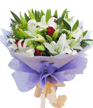 名稱(chēng):5枝百合玫瑰/柔情似水 材料:5枝多頭白百合,11枝紅玫瑰,黃鶯穿插. 包裝:藕荷色手揉紙圓形尖角包裝,橘色絲帶束扎. 花語(yǔ):與你在一起的時(shí)候,感覺(jué)總是那么輕松,似水柔情對(duì)你是最恰當(dāng)?shù)男稳?讓我