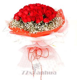 「材 料」 33枝上等紅玫瑰,滿天星圍邊豐滿點(diǎn)綴。 |