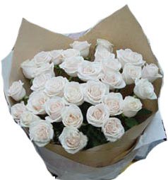 「材 料」 33枝白玫瑰、綠葉適量 。 淺色皺紋紙、土黃色皺紋紙、玻璃紙、草繩花結(jié) 「包 裝」 淺色皺紋紙、土黃色皺紋紙、玻璃紙、草繩花結(jié) 「花 語」 沒有繁文縟節(jié)型式,彼此心靈相許,繾綣一生的約