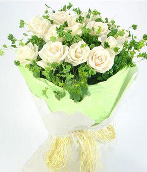 [名稱] 愛的感覺 [包裝] 綠色棉紙圓形包裝,白色棉紙外圍,草繩束扎。 [花材] 21枝昆明精品白色玫瑰,葉上黃金(或黃鶯)豐滿。 [花語] 風(fēng)是透明的,雨是滴答的,云是流動的,歌是自由的,愛是用心的,戀是瘋狂的,天是永恒的,你是難忘的.
