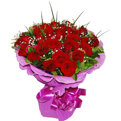 【花材】 33支紅玫瑰,滿天星,配草,紫色卷邊皺紋紙圓形包裝,同色絲帶束腰。 【花語】 你能找到理由難過,也一定能找到理由快樂,懂得放心的人找到輕松,懂得遺忘的人找到自由,懂得關(guān)懷的人找到朋友。 |