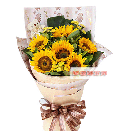 材 料: 6枝向日葵,5"小熊一只,黃色小雛菊搭配,綠葉適量 |