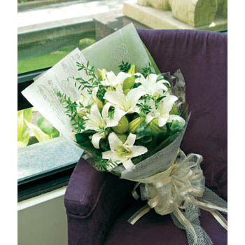 [材 料]:5支多頭白色香水百合 綠葉間插 [包 裝]:英文報(bào)紙單面花束 絲帶打結(jié) [花 語]:
