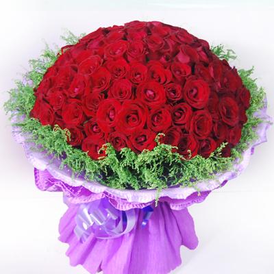 【花材】 99支昆明A級(jí)紅玫瑰+外圍黃鶯;淡紫色進(jìn)口卷邊紙圓形包裝 . 【花語(yǔ)】 特別的愛(ài),送給特別的你,都說(shuō)玫瑰代表愛(ài)情,為你送去一份至純至真的愛(ài),為你送上長(zhǎng)長(zhǎng)久久的情