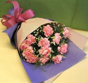 花材:12朵粉色康乃馨,配水晶花,紫色皺紋紙韓式斜面包裝,系紅色蝴蝶結(jié)。 |