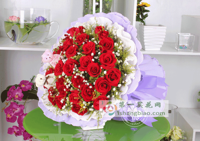 材料:精選33朵紅玫瑰紫色包裝+2只小熊款 |