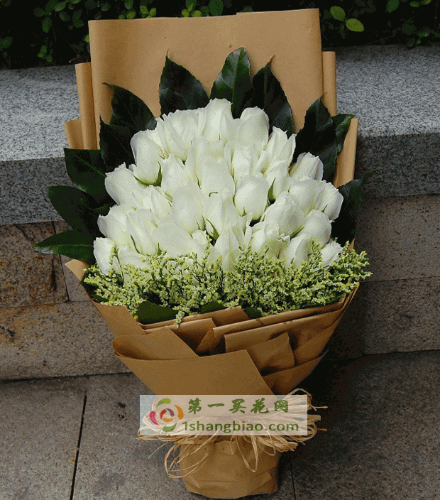材料:33朵白玫瑰,水晶草加綠葉搭配 包裝:復(fù)古牛皮平板紙單面包裝 |
