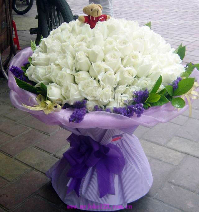 浪漫花語(yǔ): 托白云送去我綿綿不盡的思念,托清風(fēng)送去我輕輕的祝福。 商品材料: 99支白玫瑰,勿忘我綠葉點(diǎn)綴,小熊一支 商品包裝: 內(nèi)層紫色網(wǎng)紗,外層紫色瓦楞紙包裝 |