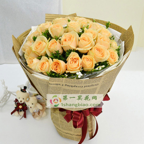 【花材】:33朵香檳玫瑰+石竹梅,隨機送2小熊 |