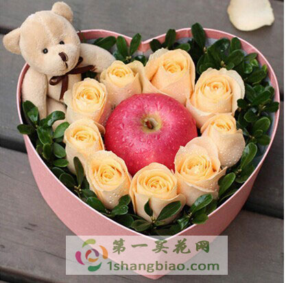 材料:9朵香檳玫瑰中間一個平安果,送小熊一個包裝:精美心形禮盒(顏色隨機(jī)) |