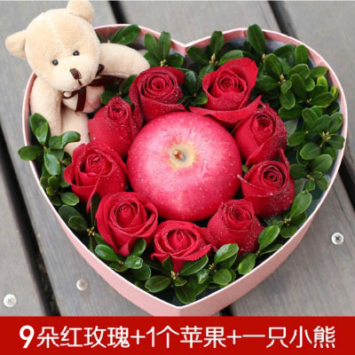 材料:9朵玫瑰+蘋果一個+小熊1個 包裝:精美心形禮盒包裝 |
