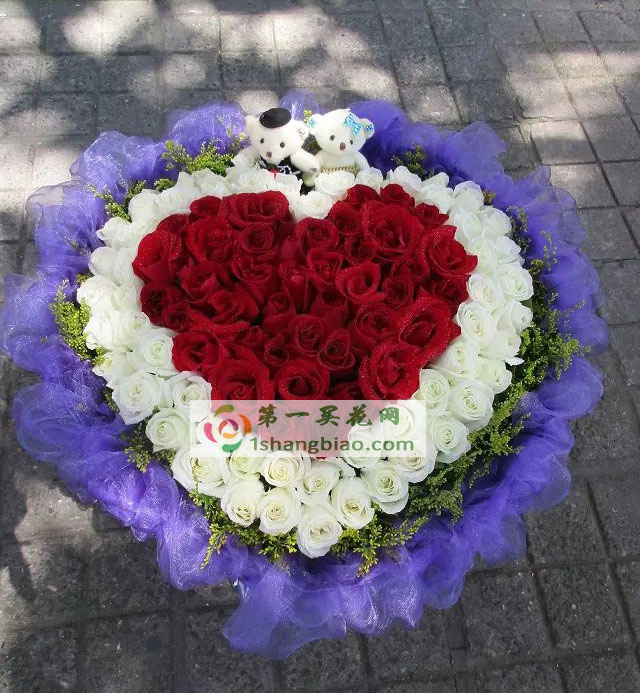 33朵紅玫瑰居中,外圍66朵白玫瑰 心形插法,黃鶯外圍一圈 紫色網(wǎng)紗高檔心形包裝 |