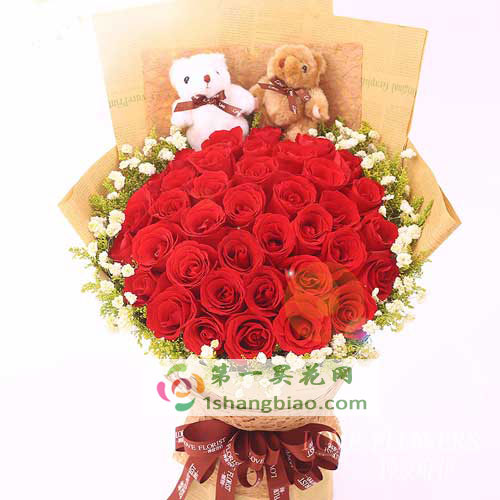 商品材料: 33朵紅玫瑰,滿天星黃英圍繞,小熊一對 商品包裝: 英文報單面精美包裝 |