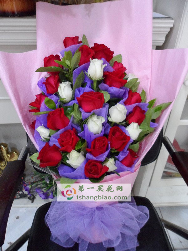 22朵紅玫瑰+11朵白玫瑰(共33朵玫瑰)紫色棉紙單子包裝,綠葉豐滿 粉色包裝紙扇形包裝,淡紫色網(wǎng)紗蝴蝶結(jié) |