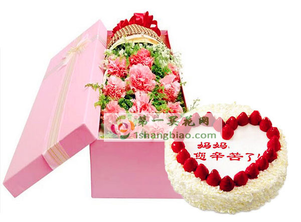 材料:11朵粉色康乃馨,黃鶯等豐滿,扇形包裝,粉色長方形禮盒優(yōu)先(沒有粉色禮盒就其他顏色) 蛋糕:10寸心形水果奶油蛋糕,表面寫:媽媽,您辛苦了 |