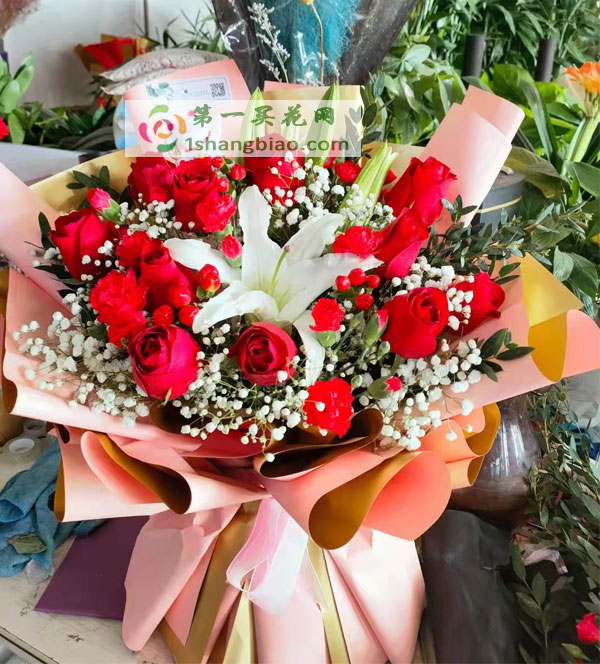 材料:19朵玫瑰,2支多頭香水百合,搭配滿天星,相思梅,紅豆)等