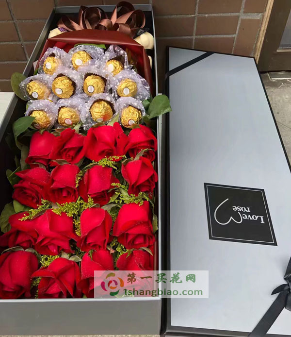 材料:16朵紅玫瑰+11顆巧克力,黃英 +梔子葉等豐滿