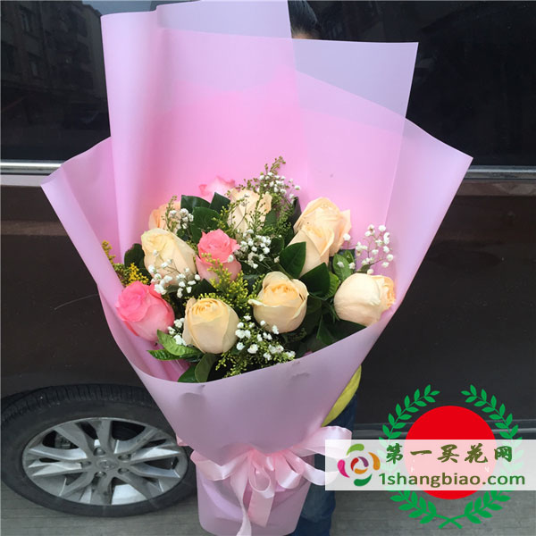 材料:9朵香檳玫瑰+2朵粉色玫瑰,搭配滿天星 黃英梔子葉 包裝:霧面紙扇形包裝 |