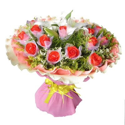 【花材】 19枝粉玫瑰(用紫色紗網(wǎng)單枝包裝)+3朵白百合+情人草+配葉,粉色卷邊皺紋紙圓形內(nèi)包裝和淡綠色卷邊皺紋紙外包裝 |