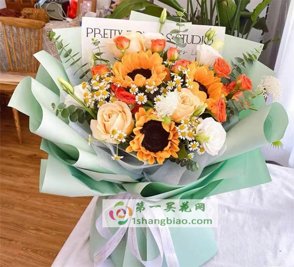 材料:3朵向日葵+3朵香檳玫瑰+6支白色洋桔梗,搭配橙色迷霧泡泡,小皺菊。尤加利葉 包裝紙:紫色歐亞紙扇形包